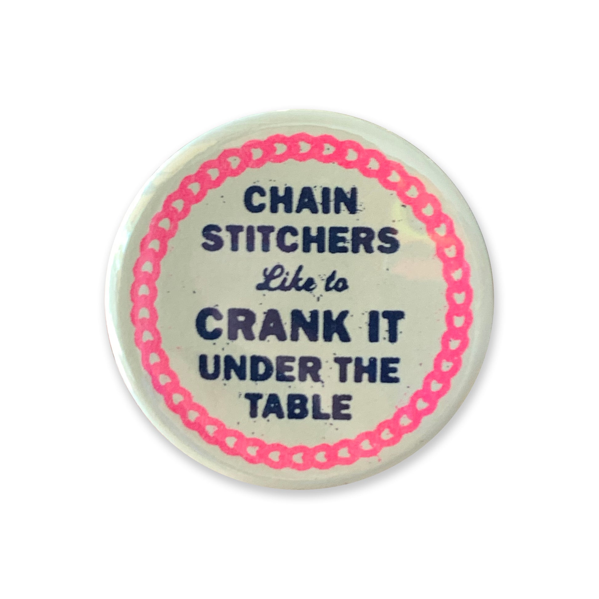 This one is a joke for all of my fellow Chain Stitchers. Our machines are operated by a crank that is underneath the machine table. Saying "Chain Stitchers Like To Crank It Under The Table" sounded like it needed to be on a button